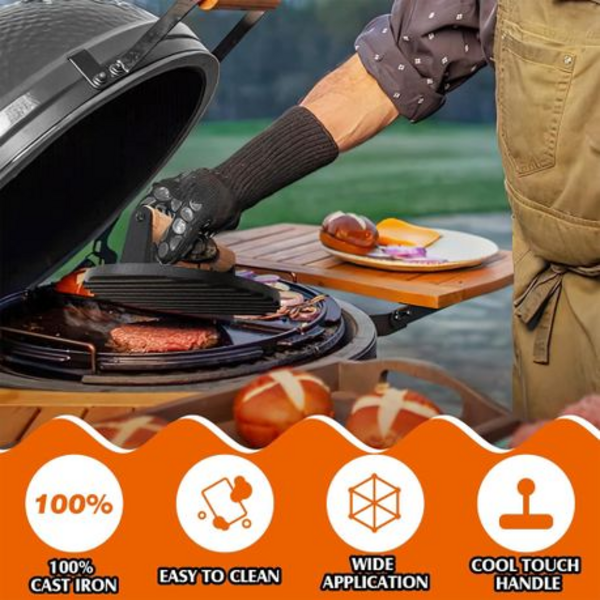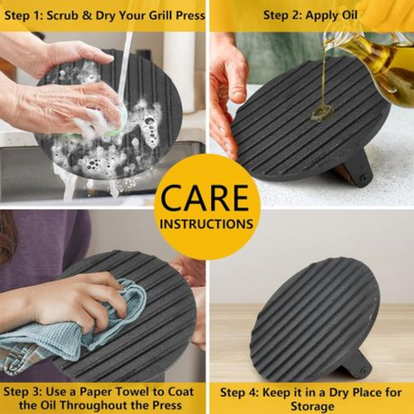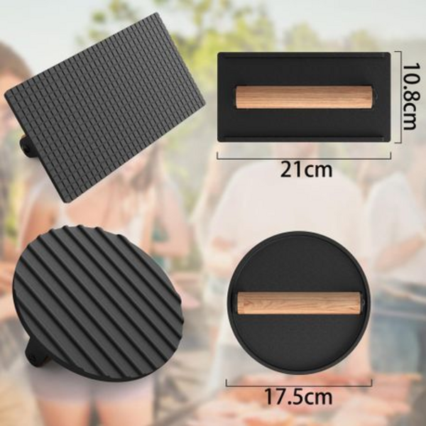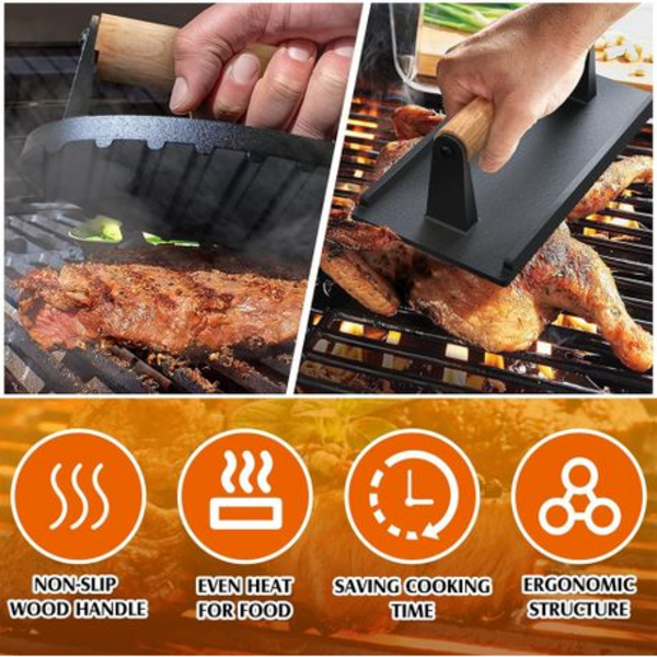 -Heavy Duty Grilling Tools: Both rectangular and round grilling tools are made of 100% food grade cast iron without any harmful coating. They’re heavy-duty and corrosion-resistant, and the press’s large surface area can press down more food at once.