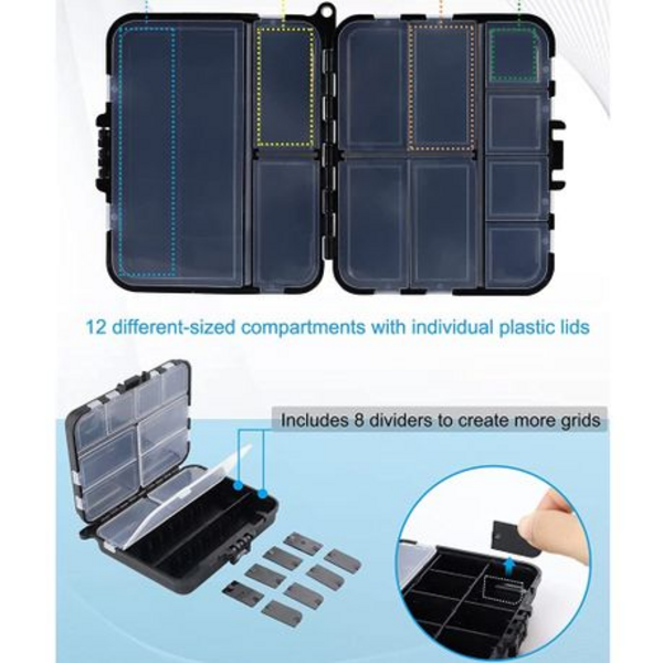 - 1 × Lightweight tackle box – 12 cm × 9 cm × 4 cm (12 compartments + 8 dividers)